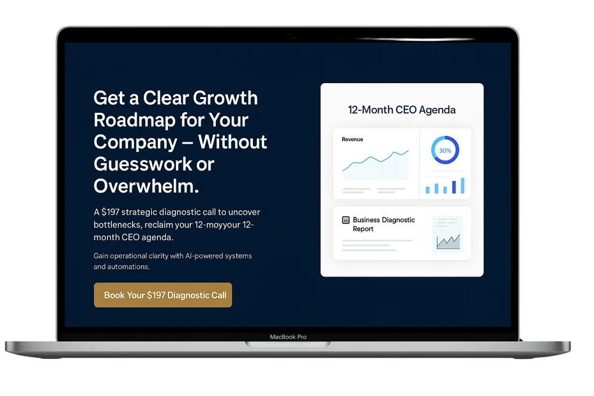 In this 45-minute diagnostic session, you’ll uncover your biggest bottlenecks, identify where you're losing time and money, and receive a customized 12-month CEO agenda that shows you exactly what to automate, what to optimize, and what to delegate next.